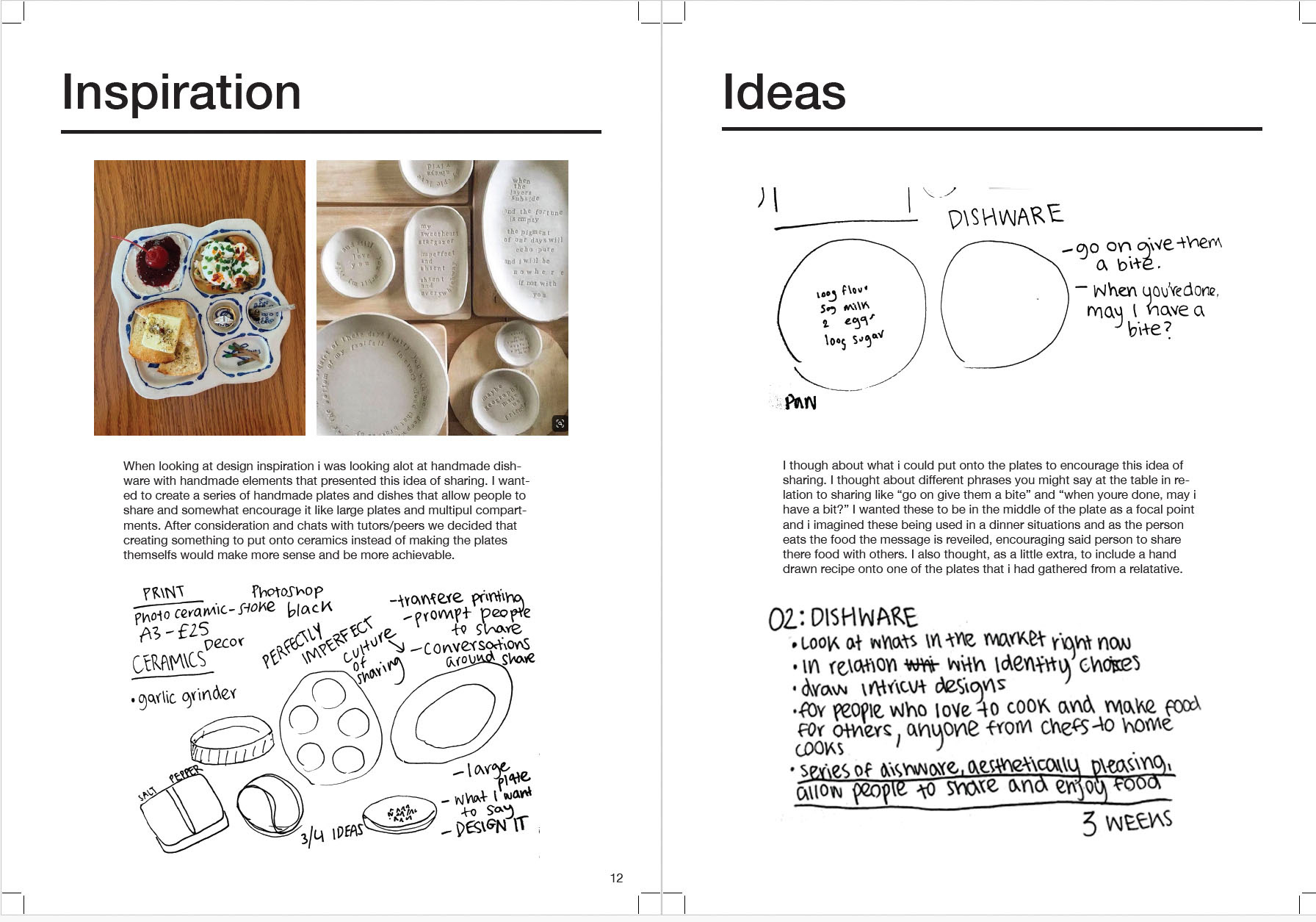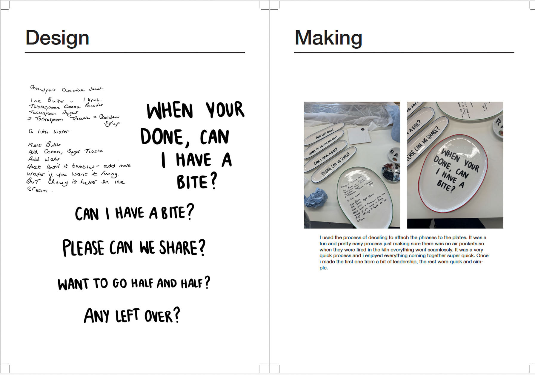 A selection of dishware intended for people who love to cook and share the joy of food with others. I wanted the phrases to acknowledge multiple people at the table and present the idea of sharing food and sharing moments with one another. Because i wanted this whole project to come together and link into a bigger picture, i knew that this dishware had to be aestheticlly pleasing and work with other projects i am doing. Thoughout my time on the course i have enjoyed working with physical materials and creating things by hand so i knew creating dishware was something i wanted to do.