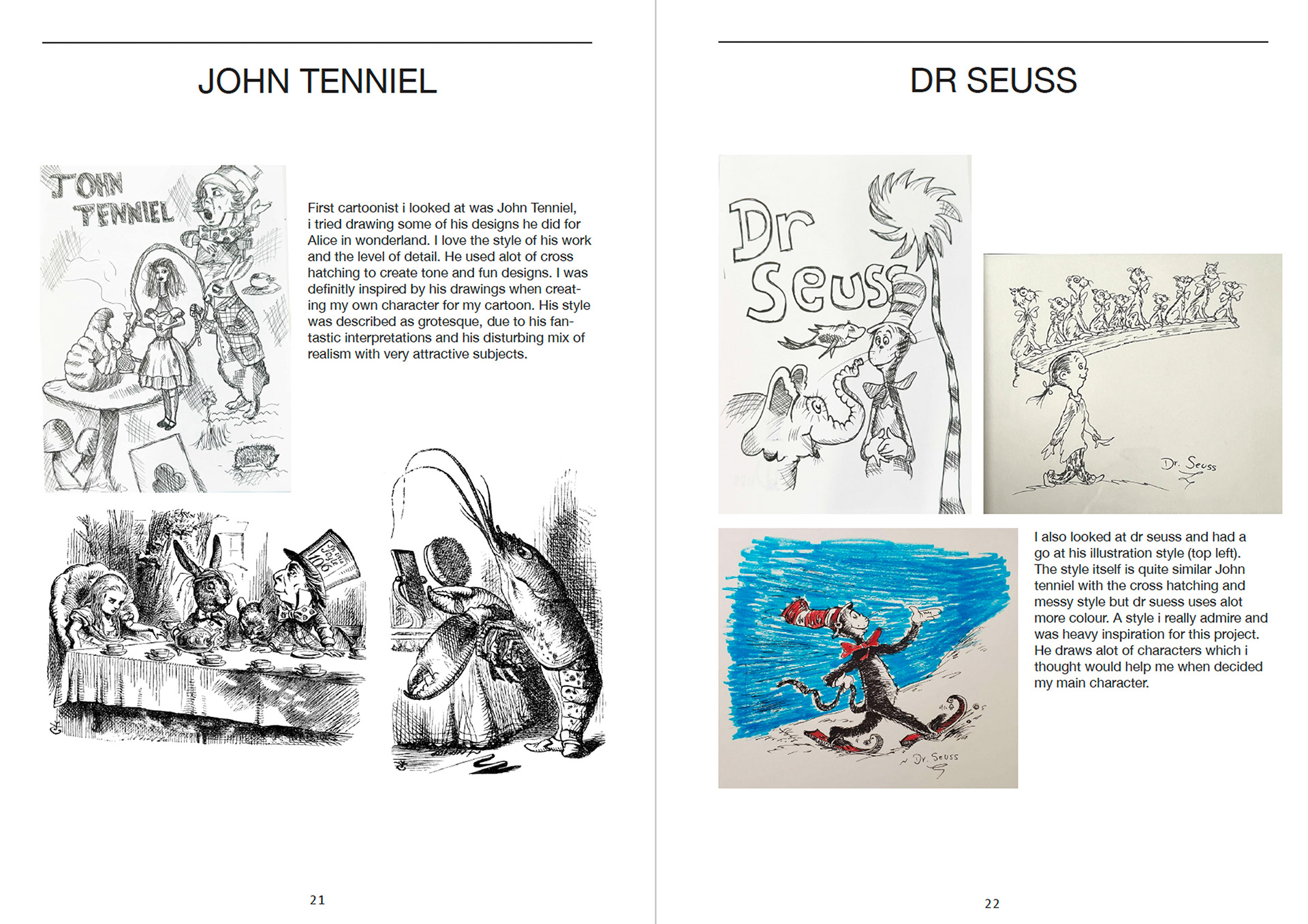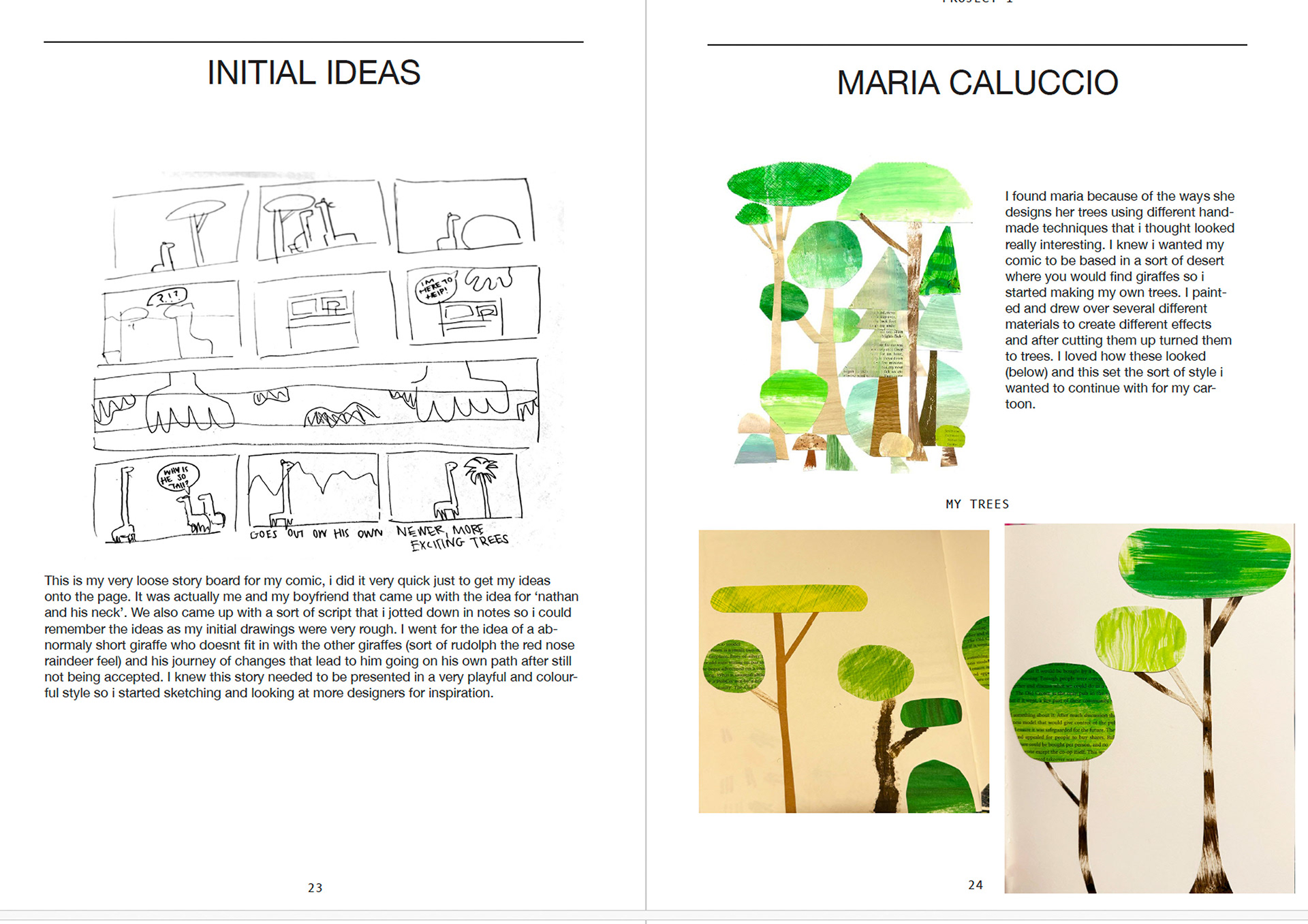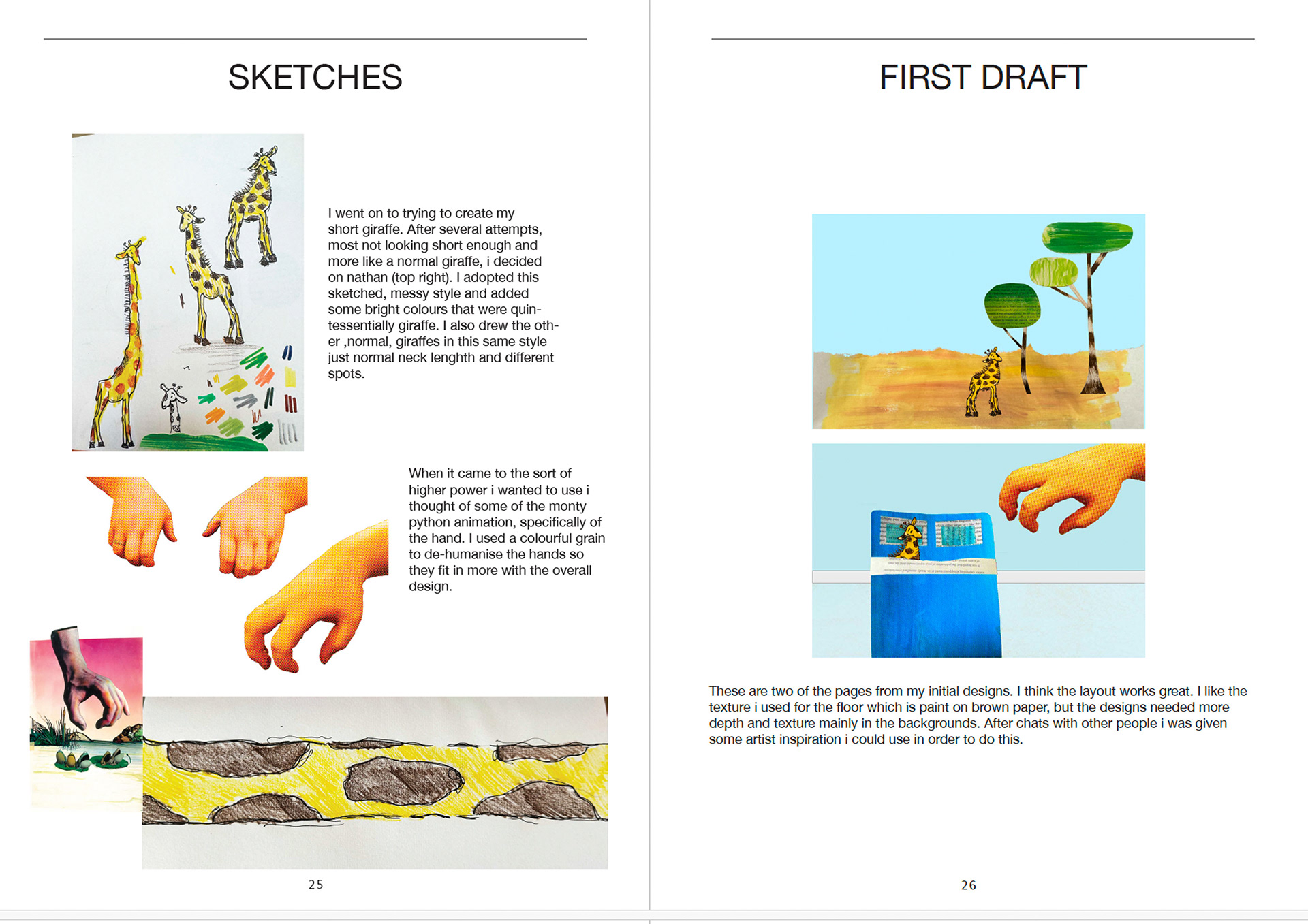 A comic with the idea of an abnormally short giraffe who doesn't fit in with the other giraffes and his journey of changes that lead to him going on his own path after still not being accepted. Presented in a very playful and colourful style with mixed media.