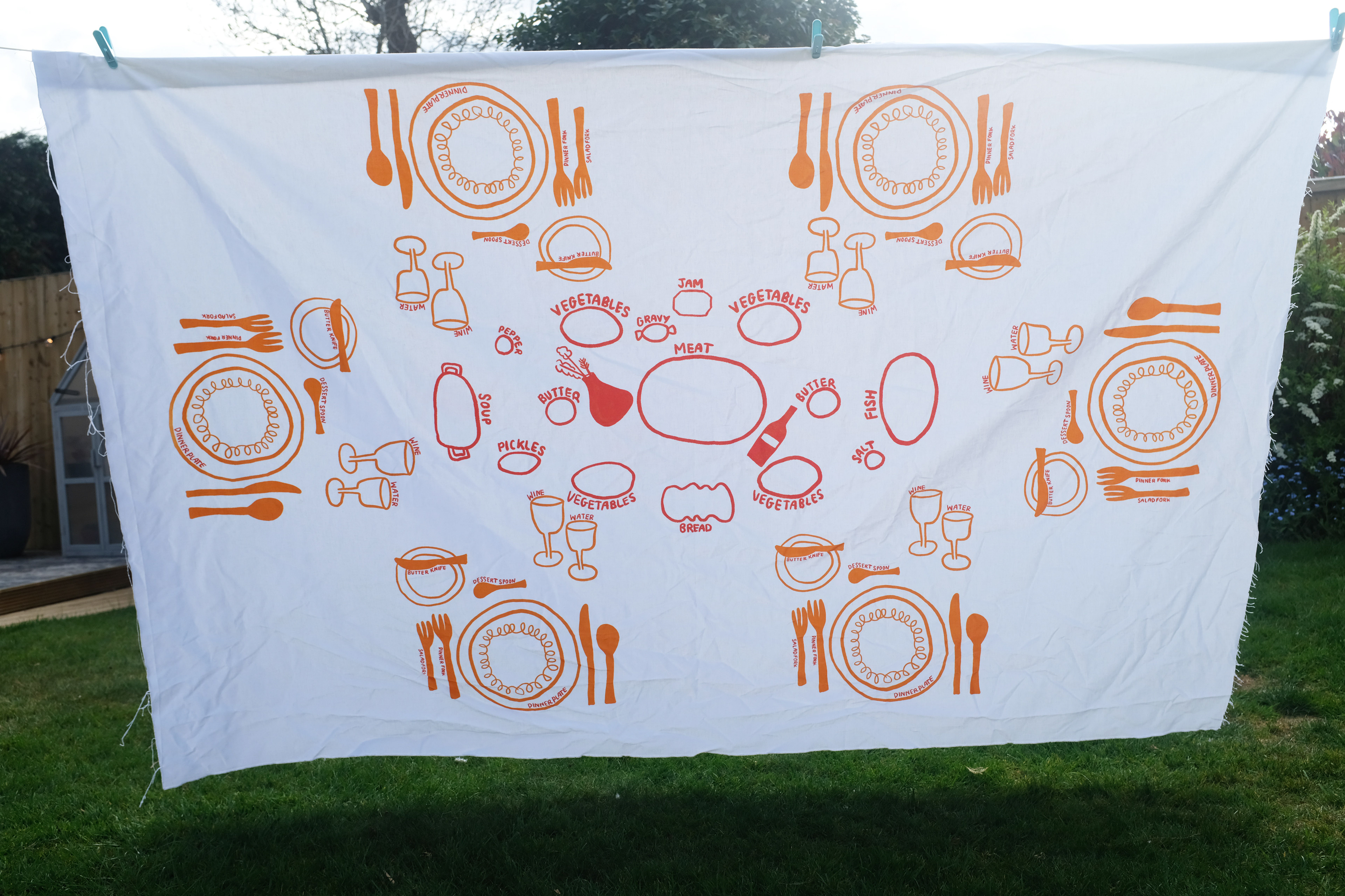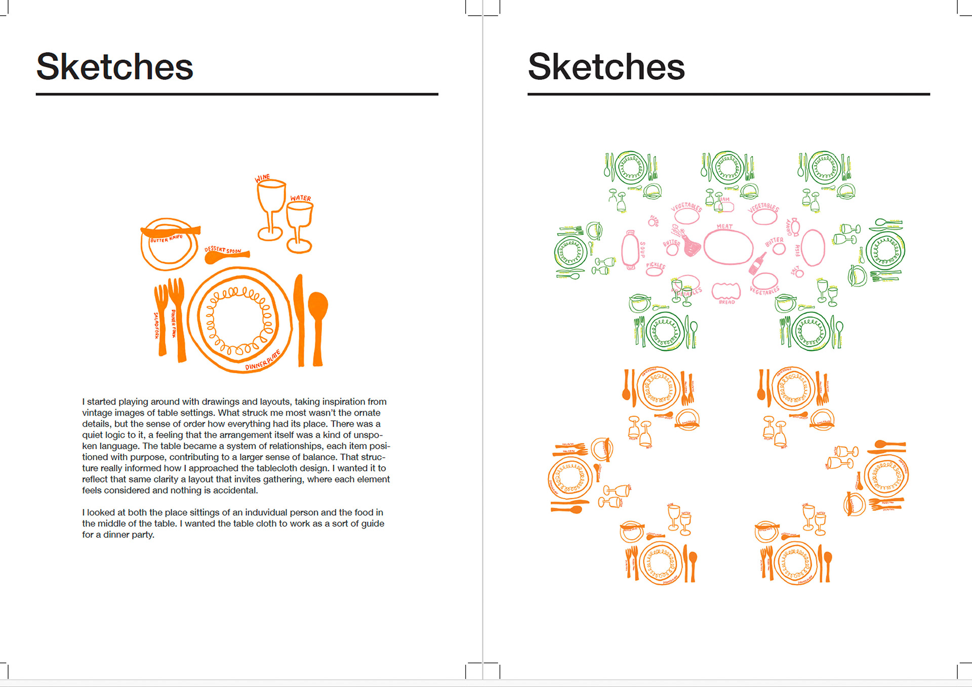 I wanted to create a tablecloth as part of a broader series of dinner party paraphernalia. There’s something deeply symbolic about the tablecloth it’s the canvas of the evening, the quiet foundation that supports every conversation, every course, every shared moment. While the glassware sparkles and the cutlery gleams, the tablecloth sets the tone, grounding everything with texture, color, and presence. It was about storytelling building a world where each item, from the napkin rings to the serving trays, spoke to a cohesive vision. I wanted it to feel intentional, like it belonged to a specific kind of gathering intimate, elegant, maybe a little eccentric.