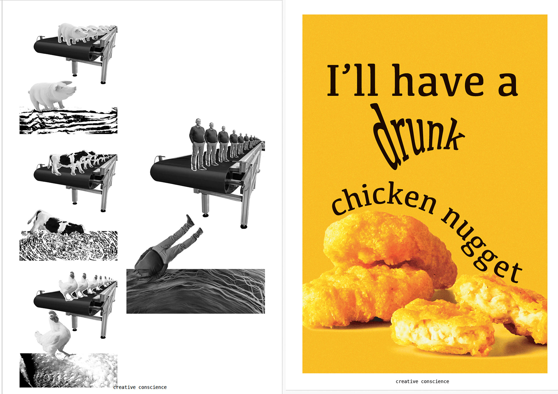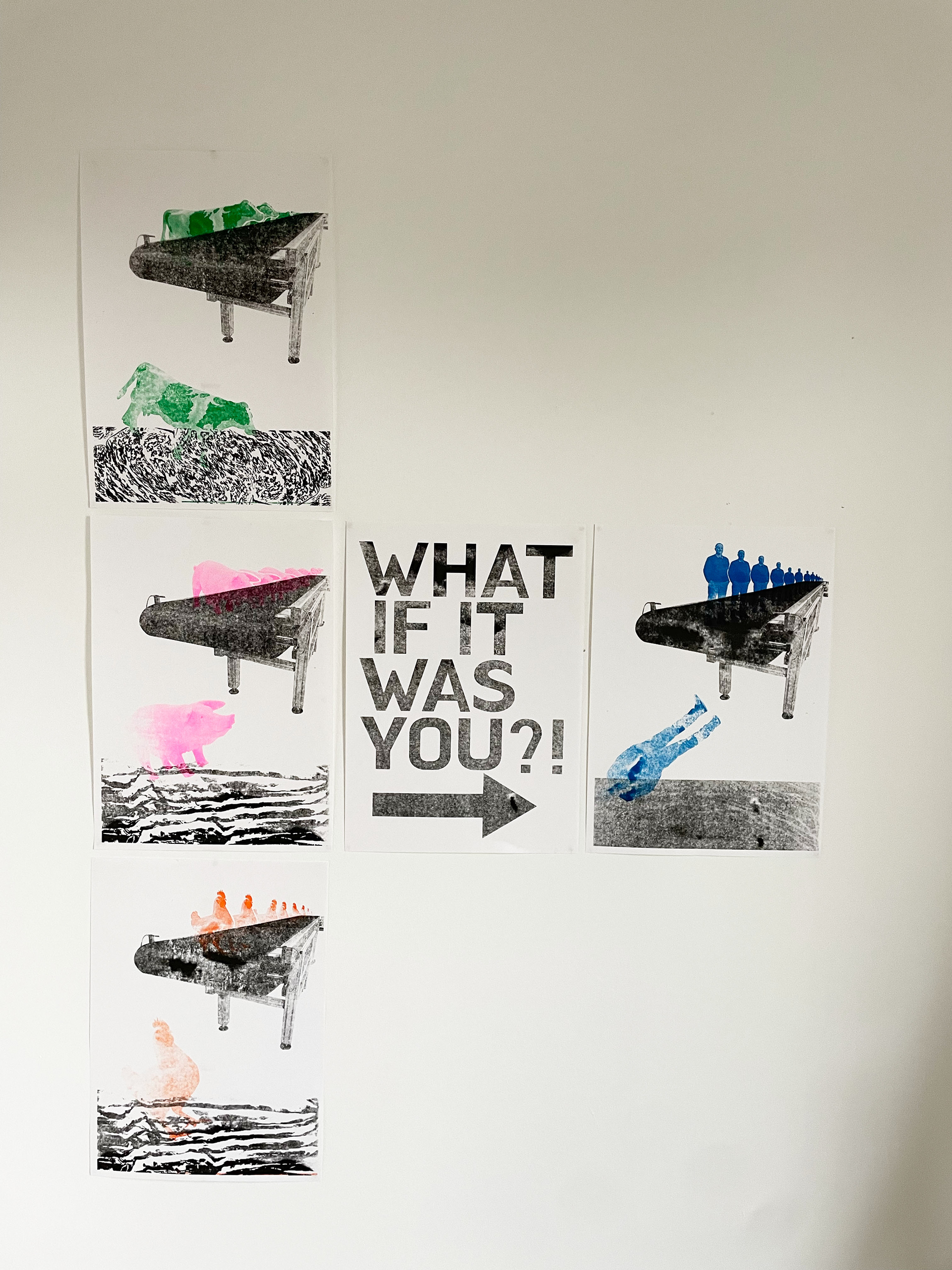 I did my final poster designs using the risograph machine. I wanted to make a big statement to make the audience ask a question. I made each animal a different riso colour that i thought associated best with each character like pink for the pig and green for the cow.